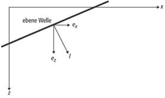, sie ist aber nicht anwendbar auf die Komponenten der Geschwindigkeiten. Generell gilt, daß die Geschwindigkeit, mit der sich eine ebene Welle in eine beliebige Richtung ausbreitet, höher ist als die Geschwindigkeit in Ausbreitungsrichtung. Zwischen dem in der Wellengleichung eingeführten Wellenzahl-Vektor