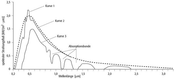 Sonnenstrahlung: Darstellung der extraterrestrischen Sonnenstrahlung (Kurve 1); Kurve 2 stellt den spektralen Strahlungsfluß von der Sonne im Vergleich zur Emission eines Schwarzen Körpers mit einer Temperatur von 5900 K dar; nach Durchgang durch die Erdatmosphäre ist die Sonnenstrahlung an der Erdoberfläche durch Streu- und Absorptionsprozesse deutlich geschwächt (Kurve 3); die Absorptionsbanden, insbesondere durch Wasserdampf und Kohlendioxid verursacht, sind deutlich zu erkennen. Sonnenstrahlung: