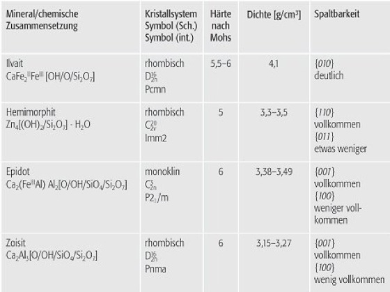 Sorosilicate (Tab.): Beispiele für Sorosilicate (Sch.=Schoenflies, int.=international). Sorosilicate (Tab.):