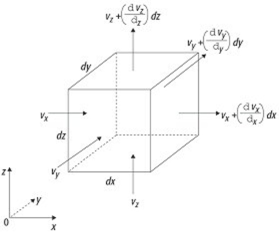 stationäre Strömungsverhältnisse: durchströmtes Volumenelement eines Grundwasserleiters mit Eintritts- und Austrittsgeschwindigkeiten. stationäre Strömungsverhältnisse: