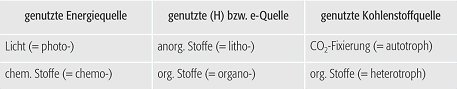 Stoffwechsel (Tab.): Einteilung der Lebewesen nach ihren Stoffwechselprinzipien (genutzte Energie-, Wasserstoff- bzw. Elektronen- und Kohlenstoffquelle). Es sind alle Kombinationen möglich.