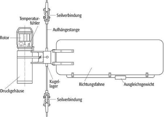 Strommesser, Strömungsmesser, Gerät zur Messung der Geschwindigkeit und Richtung von Strömungen in Gewässern. Dabei kommen elektromechanische, induktive und akustische Prinzipien zur Anwendung. Bei elektromechanischen Geräten ( Abb. 1) wird die Bewegung des Wassers auf einen Rotor übertragen, dessen Umdrehungszahl pro Zeiteinheit gezählt und in eine Geschwindigkeit umgerechnet wird. Das Gerät ist mit einer Fahne ausgestattet, die es in Stromrichtung ausrichtet. Die Lage des Geräts wird mit einem Kompaß bestimmt. Alle Meßdaten werden digitalisiert und elektronisch gespeichert. Induktive Geräte messen die Spannung, die an einer Meßstrecke induziert wird, wenn sich das elektrisch leitende Meerwasser im Erdmagnetfeld (Erde) bewegt.