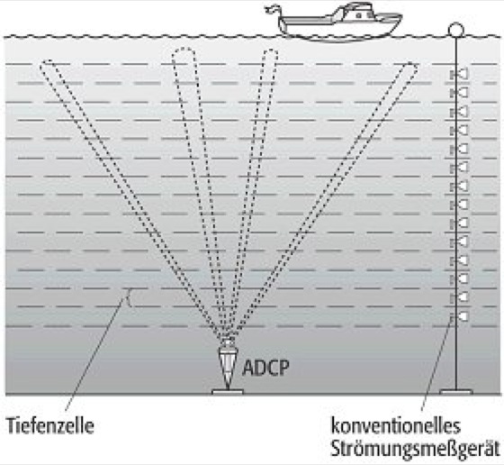 Akustische Geräte können über eine Laufzeitmessung (Laufzeit) die Veränderung der Schallausbreitung durch die Wasserbewegung entlang einer Meßstrecke erfassen. Drei senkrecht zueinander stehende Meßstrecken erlauben die Bestimmung des dreidimensionalen Strömungsvektors. Die Dopplerverschiebung eines Schallsignals (Doppler-Effekt) kann mit einem akustischen Doppler-Strömungsmesser (Acoustic Doppler Current Profiler, ADCP; ADCP-Meßverfahren) ebenfalls zur Geschwindigkeitsmessung genutzt werden ( Abb. 2). Dabei wird ein Schallbündel von einem Schallgeber ausgesendet, das an Partikeln im bewegten Wasser gestreut wird. Der rückgestreute Signalanteil wird in einer Folge von Zeitfenstern empfangen. Der Zeitpunkt des Eintreffens gibt den Abstand des streuenden Wasservolumens vom Schallgeber an, die Dopplerverschiebung des Signals die Geschwindigkeit. Durch Abtasten mehrerer Zeitfenster kann so ein Strömungsprofil gemessen werden. Die Verwendung von mindestens drei Schallstrahlen erlaubt eine Vektormessung und ermöglicht die Bestimmung der Vertikalkomponente.