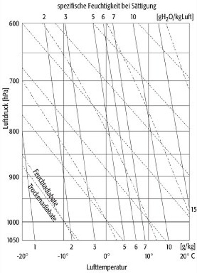 Stüve-Diagramm, Adiabatenpapier, ein von G. Stüve entwickeltes, in Mitteleuropa häufig benutztes thermodynamisches Diagramm zur Auswertung aerologischer Aufstiege, mit der Temperatur T als Abzisse und einer Exponentialfunktion des Luftdrucks p0,286 als Ordinate ( Abb.). Damit werden die Trockenadiabaten zu einer Schar von Geraden, die von rechts unten nach links oben verlaufen und sich im Nullpunkt von Temperatur und Luftdruck treffen. Die Feuchtadiabaten verlaufen in gleicher Orientierung, aber steiler und nach links gekrümmt, sie nähern sich bei Temperaturen unter -40ºC den Trockenadiabaten. Gleiche Flächen auf dem Diagramm bedeuten nicht exakt gleiche Energiebeträge.