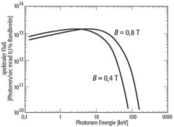 Synchrotronstrahlung: typisches Spektrum der Synchrotronstrahlung an einem Ablenkmagnet, berechnet für Dipolmagnete unterschiedlicher Stärke bei 6 GeV und 100 mA Elektronen-Strahlstrom (ESRF); B=magnetische Flußdichte. Synchrotronstrahlung: