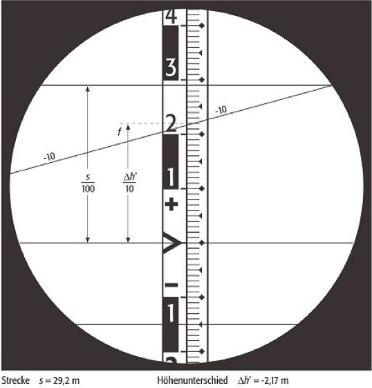Tachymeter: Gesichtsfeld des Diagrammtachymeters Dahlta 010A (s=Strecke, Δh'=Höhenunterschied). Tachymeter: