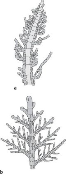 Thallophyten: Beispiele für den Aufbau von Thallophyten (Algen): a) Fadenthallus (Spermatochus) b) Gewebethallus (Halopteris). Thallophyten: