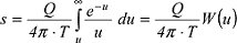 wobei r=Abstand Brunnen – Meßstelle [m], S=Speicherkoeffizient, t=Zeit seit Pumpbeginn [s] und T=Transmissivität [m2/s]) mit u als Integrationsvariablen. Die Brunnenfunktion geht in die Berechnung der Absenkung s in der Umgebung eines Förderbrunnens in die Brunnenformel von Theis: