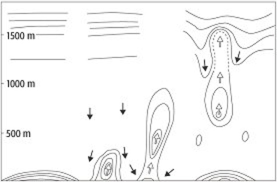 Thermik, Aufwind, durch die am Tage erfolgende Sonneneinstrahlung wird der Erdboden und die bodennahe Luftschicht vor allem im Sommer stark erwärmt. Dies erfolgt je nach Bewuchs und Lageausrichtung zur Sonne (z.B. Berghänge) unterschiedlich, so daß auch die untersten Luftschichten unterschiedlich warm werden. Da warme Luft spezifisch leichter als kältere ist, löst sie sich in sog. Thermikblasen ab und steigt auf ( Abb. ), verursacht damit als konvektive Vertikalbewegung die Thermik. Solche Warmluftblasen haben einen typischen Durchmesser von 200 bis 500 m und steigen mit einer Geschwindigkeit von 1 bis 5 m/s solange auf, bis sie das Cumulus-Kondensationsniveau (Kondensationshöhe) erreichen, in dem Wolken entstehen. Einer ersten Thermikblase folgen mit weiterer Tageserwärmung weitere Blasen nach, meist auch mit größerer Aufstiegsgeschwindigkeit, so daß sich Aufwindschläuche bilden, die gerne von Segelfliegern genutzt werden. Solange die Luft ohne Wolken zu bilden aufsteigt, wird der Vorgang Blauthermik genannt, da ja der Himmel blau bleibt. Konvektion. [WW]