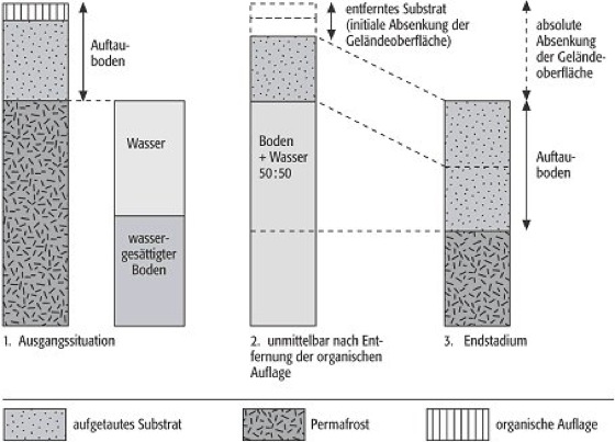 Thermokarst: schematische Darstellung der Entstehung von Thermokarstdepressionen in eisreichem Permafrost durch Entfernung der organischen Auflage. Thermokarst: