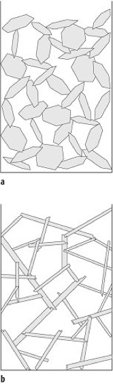 Thixotropie: schematische Darstellung der Thixotropie. Gleichgeladene Minerale bauen (meist in wäßriger Lösung) ein labiles Gerüst auf, das eine gewisse Konsistenz besitzt; bei mechanischer Entladung bricht dieses System zusammen: a) Kaolinit, b) Halloysit. Thixotropie: