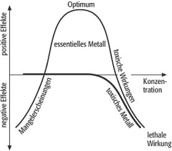toxische Metalle 1: Zusammenhang zwischen Metallkonzentration und Effekten auf die Biosphäre für essentielle (Mikronährstoffe) und toxische Metalle. toxische Metalle 1: