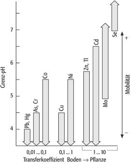 toxische Metalle, viele Spurenmetalle üben bei der Überschreitung einer Schwellenkonzentration negative Effekte auf Mikroorganismen, Pflanzen, Tiere oder Menschen aus ( Abb. 1). Diese Schwelle wird in der Toxikologie durch die höchste Dosis bzw. Dosisrate, die noch nicht zu erkennbaren nachteiligen Wirkungen führt (NOAEL=no observed adverse effect level), bzw. durch die geringste Dosis, die bereits zu erkennbaren nachteiligen Wirkungen führt (LOAEL=lowest observed adverse effect level), charakterisiert. Diese sind auch Grundlage für die schutzgut- und z.T. metallspeziesorientierte Ableitung von Schwellen- und Grenzwerten. Zu unterscheiden ist dabei zwischen einer akuten (sehr rasch einsetzenden) und einer chronischen Wirkung (Effekte geringer, über längere Zeiträume eingenommener Dosen). Entsprechend der Zielgruppe kann die toxische Wirkung der Metalle klassifiziert werden in Phytotoxizität, Zootoxizität und Humantoxizität. Neben ihrer toxischen Wirkung zeigen viele Metalle in kleinen Konzentrationen auch positive Effekte (essentielle Metalle, Mikronährstoffe). Das Eindringen toxischer Metalle in die Nahrungskette beginnt häufig mit ihrer Mobilisierung in Böden und der Aufnahme in Nutzpflanzen. Generell nimmt dabei die Mobilität der Metalle mit sinkendem Boden-pH-Wert (Grenz-pH-Wert) zu ( Abb. 2). Für den oft mit Methylierungsschritten verbundenen Übergang in die Pflanzen wurden experimentell und in Freilandstudien Transferkoeffizienten bestimmt, die ausdrücken, wie stark die Metallkonzentrationen der Pflanzen die Gehalte des Substrates widerspiegeln ( Tab.). [TR]
