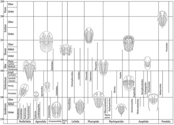 Systematisch unterscheidet man neun Trilobitenordnungen ( Abb. 6): a) Redlichiida (Unter- bis Mittelkambrium): mit großem, halbkreisförmigem Cephalon, zahlreichen, meist bestachelten Thorakalsegmenten und kleinem Pygidium. b) Agnostida (Unterkambrium bis Oberordovizium): mit fast gleichgroßem Kopf- und Schwanzschild und lediglich zwei Thorakalsegmenten, Formen meist blind, Lebensweise mit aufeinandergeklapptem Kopf- und Schwanzschild. c) Naraoiidae (Mittelkambrium, Burgess Shale): ohne Thorakalsegmente, Panzer unverkalkt. d) Corynexochida (Unterkambrium bis Mitteldevon): sehr heterogene Gruppe, Glabella parallel begrenzt oder nach vorn erweitert, opisthopare Sutur, 7-8 Thorkalsegmente, Hypostom z.T. mit Rostralplatte verschmolzen. e) Lichida (Mittelkambrium bis Mitteldevon): stark bestachelte Trilobiten und unter Umständen sehr große Formen mit z.T. tuberkuliertem Panzer, Glabella mit bis zu vier Glabellarfurchen, opisthopare Sutur, Größe des Pygidiums je nach Untergruppe verschieden. f) Phacopida (Unterordovizium bis Unterdevon) mit vorherrschend proparen Suturen. Unterteilung in drei Unterordnungen: Cheirurina (mit nach vorn verbreiterter Glabella und vier Glabellarfurchen, 8-19 Thorakalsegmente, Pygidium bestachelt oder ausgefingertem Rand), Calymenina (mit nach vorn verschmälerter Glabella und gonatoparer Sutur, Thorax mit 11-13 Segmenten, Pygidium gerundet oder subdreieckig) und Phacopina (mit proparer Sutur, Glabella nach vorn verbreitert, ohne Rostralplatte, Thorax mit 11 Segmenten, Pygidium klein, gut entwickelter Einrollungsmechanismus). g) Ptychopariida (Unterkambrium bis Unterdevon): große paraphyletische Gruppe mit stark modifizierten Gruppen, typische Vertreter mit nach vorn verschmälerter Glabella und geraden Glabellarfurchen; großer Thorax, aber kleines Pygidium. h) Asaphida (Unterkambrium bis Silur): Glabella undeutlich begrenzt, 8 Rumpfsegmente und großes bis sehr großes Pygidium, breiter Umschlag des Panzers auf Ventralseite. i) Proetida (Ordovizium bis Perm): große stark gewölbte Glabella, opisthopare Sutur, Cephalon mit Wangenstacheln, Rostralplatte nach hinten schmaler werdend, Thorax mit 8-10 Segmenten, Pygidium meist gefurcht und unbestachelt.