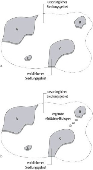 Trittsteinbiotop: nachträgliche Wieder-Verbindung von Teilen des ehemals geschlossenen Siedlungsgebiet einer Art durch Trittsteinbiotope. Trittsteinbiotop: