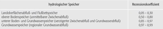 geschrieben werden, wobei Qo den Anfangsabfluß, kr den Rezessionskoeffizienten und t die Zeit darstellen. Die Tabelle enthält Näherungswerte der Rezessionskoeffizienten (Leerlaufkoeffizient) für die verschiedenen hydrologischen Speicher. [HJL]