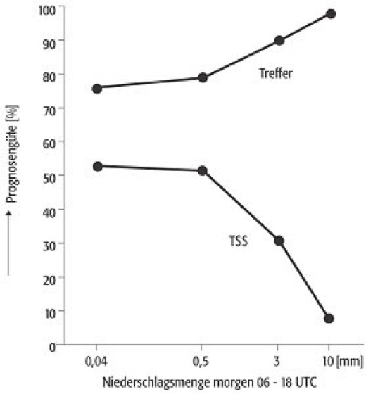TSS: Am Beispiel der kurzfristigen Niederschlagsvorhersage für viele deutsche Orte aus dem Jahr 1996 läßt sich u.a. zeigen, daß die traditionellen Trefferprozente nicht immer ein geeignetes Prüfmaß darstellen. Für verschiedene Schwellenwerte (Abszisse) wurde die Qualität der so erhaltenen, alternativen Ja/nein-Aussagen einmal mittels der herkömmlichen Trefferquote, zum anderen mittels TSS beurteilt. Erwartungsgemäß sinkt die Vorhersagegüte TSS, je seltener das vorherzusagende Niederschlagsereignis eintritt. Starkniederschläge über 13 mm/12 h länger als 27 Stunden im voraus punktgenau vorherzusagen, war 1996 noch nicht möglich. Orientiert man sich an den traditionellen Trefferquoten, gelangt man zu einer irreführenden, gegenteiligen Bewertung. Übrigens wurden im Jahre 1998 TSS-Werte für die Schwelle 10 mm/12 h je nach Vorhersagemethode von 17 bis 30% erreicht. TSS: