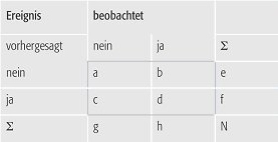 TSS, true skill statistic, wahres Gütemaß ( Abb.); ein bereits 1884 von J. Finley in den USA zur Überprüfung von Tornado-Vorhersagen entwickeltes Verifikationsmaß. Es besitzt u.a. folgende wichtige Eigenschaften: es bestimmt anhand einer 2x2 Kontingenztabelle, d.h. auf der Grundlage binärer oder alternativer Aussagen, den quantitativen Grad des Zusammenhangs zwischen Vorhersage und Beobachtung; es ist leicht verständlich, nimmt Werte zwischen -1 und +1 an und es benutzt alle relevanten Informationen ( Tab.):