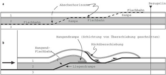Überschiebung, eine Störung, an der sich das Hangende aufwärts über das Liegende bewegt hat, und deren steilste Teile unter einem Winkel 45º zur Horizontalen angelegt wurden. Überschiebungen bewirken eine Verkürzung und Verdickung der betroffenen Gesteinseinheiten. Sie haben oft einen gestuften Verlauf mit ungefähr horizontalen Flachbahnen und steiler einfallenden Rampen ( Abb.). Rücküberschiebungen sind gegen die regional vorherrschende Transportrichtung gerichtet.