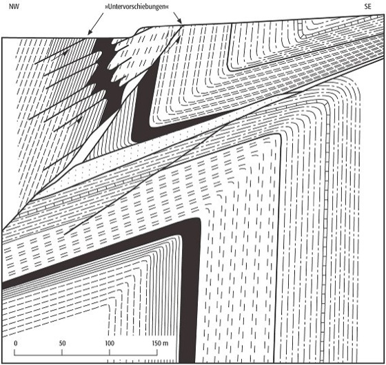 Untervorschiebung: Untervorschiebungen (in diesem Fall wahrscheinlich überkippte Überschiebungen) im Thüringischen Schiefergebirge. Untervorschiebung: