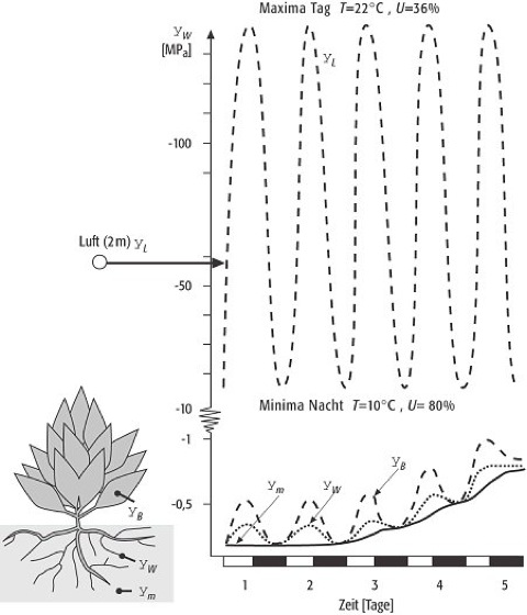 Die Pflanzen steuern durch Öffnen der Stomata die Transpiration (Stomatawiderstand). Sie reagieren damit auf schwankende Wasserpotentiale in den Schließzellen der Stomataöffnungen und beeinflussen auch die Photosyntheseleistung der Pflanze. Wenn der osmotische und der hydraulische Druck in den Schließzellen unter bestimmte Grenzen fallen, schließen sich die Stomata vollständig. Diese Grenzen hängen von der Pflanzenart ab. Der gleiche Vorgang läuft bei Dunkelheit ab, da keine Photosynthese stattfinden kann. Die Wasseraufnahme aus dem Boden findet solange bei geschlossenen Stomata statt, bis der Potentialausgleich zum Bodenwasser erfolgt ist ( Abb. 4). Mit dem Wachstum der Wurzeln und der oberirdischen Pflanzenteile nehmen die Wasserpotentiale von Boden, Wurzeln und Blättern während der Vegetationszeit zunächst zu.