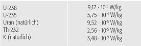 Wärmeproduktion (Tab.): Wärmeproduktionsraten beim Zerfall radioaktiver Elemente.