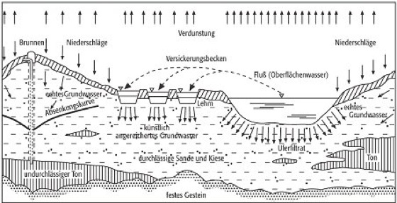 Grundwasser wird entweder als echtes Grundwasser gewonnen, das aus der Versickerung von Niederschlägen gebildet wurde, oder als uferfiltriertes Grundwasser (Seihwasser), das aus Flüssen und Seen infolge eines natürlich oder künstlich erzeugten Wasserspiegelgefälles in den Grundwasserleiter eindringt. Bei der künstlichen Grundwasseranreicherung wird Wasser aus Oberflächengewässern mittels Gräben, Versickerungsbecken oder Schluckbrunnen zunächst versickert, um nach einer ausreichend langen Bodenpassage wieder gefördert zu werden (Wasseraufbereitung). Die Grundwasserförderung erfolgt über Brunnen, Sickerleitungen oder bei natürlichen Austritten durch Quellfassungen. Im Einzugsgebiet einer Wassergewinnungsanlage oder in Teilen davon können zum Schutz des Grundwassers Nutzungsbeschränkungen ausgesprochen werden (Wasserschutzgebiet). Uferfiltrat. [EWi]
