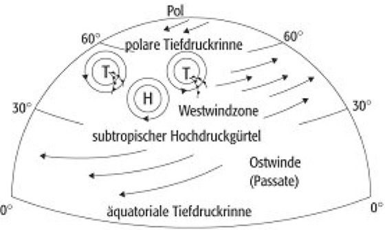 Westwinddrift: schematische Darstellung der Windzonen und Druckgürtel der Nordhemisphäre. Westwinddrift: