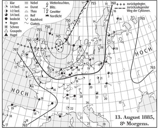 Wettervorhersage 3: in Zeitungen veröffentlichte Wetterkarte der Seewetterwarte Hamburg vom 13. August 1885. Die Fronten (Tiefausläufer) und die Höhenwetterkarten waren noch nicht entdeckt. Wettervorhersage 3: