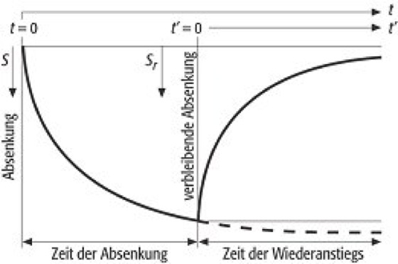 Mathematisch läßt sich der Wiederanstieg mit der Überlagerung zweier Effekte nach dem Superpositionsprinzip beschreiben. Dieses besagt, daß die Absenkungs- bzw. Anstiegsbeträge zweier oder mehrere Brunnen sich an jeder Stelle gerade addieren. Die Wiederanstiegsphase läßt sich beschreiben mit der Addition der Absenkung nach der Brunnenformel von Theis: