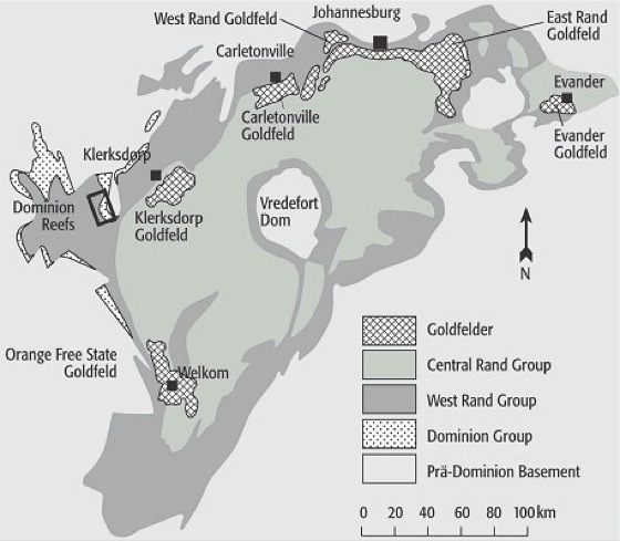 Witwatersrand Gold-Uran-Seifenlagerstätte 1: das Witwatersrand-Becken und die Lage der wichtigsten Goldfelder. Witwatersrand Gold-Uran-Seifenlagerstätte 1: