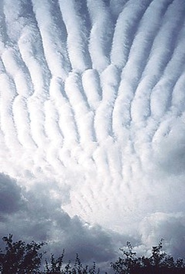 Wolkensymbole 13: Bänke von Altocumulus translucidus, ständig sich verändernd und/oder in mehreren Höhen (CM4). Wolkensymbole 13: