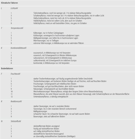 Zeigerwerte, der deutsche Geobotaniker Ellenberg hat 1974 die Zeigerwerte als ein einfaches Zahlenschema eingeführt, um die Pflanzen in Mitteleuropa nach ihren Standortansprüchen zu kategorisieren. Anhand dieser Werte lassen sich die Pflanzen als Zeigerarten bei der Bioindikation (Bioindikator) verwenden. Das System enthält in einer neunstufigen Skala 6 Ziffern in zwei Dreiergruppen: die ersten drei Zahlen beschreiben eher klimatische Ansprüche: Licht, Temperatur und Grad der Kontinentalität, die zweite Zifferngruppe steht für edaphische Faktoren: Feuchte (12stufig), Reaktion (Boden-pH) und Stickstoffgehalt. Dazu sind angegeben ein x für indifferentes und ein ? für unbekanntes Verhalten ( Tab.).