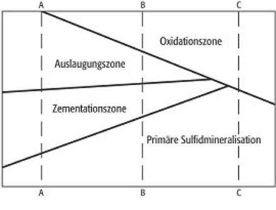 Zementationszone: supergene Zonierung in Sulfiderz-Lagerstätten. Die Schnitte A, B und C zeigen drei mögliche Abfolgen, abhängig von klimatischen Bedingungen, vom Grundwasserspiegel und vom Erosionsniveau. Zementationszone: