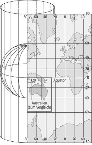 Zylinderentwürfe, Abbildung der Erdoberfläche oder eines Teils davon in die Ebene. Als Zwischenabbildungsfläche dient ein Zylindermantel, dessen Achse mit der Erdachse zusammenfällt ( Abb. 1, α=0º) oder mit ihr einen rechten (α=90º) oder einen beliebigen Winkel (0º α 90º) bildet. Entsprechend entsteht ein Zylinderentwurf in polarer, transversaler oder allgemeiner Lage. Der Zylindermantel kann verzerrungsfrei in die Ebene abgewickelt werden. Für die Abbildung der Kugel auf den Zylindermantel ( Abb. 2) werden dem vorgesehenen Verwendungszweck entsprechende mathematische Gesetzmäßigkeiten genutzt. Hierbei entstehen Verzerrungen, deren Werte nach der Verzerrungstheorie aus den Abbildungsgleichungen berechnet werden. Die Verzerrungen sind am geringsten in der Nähe des Berührungskreises zwischen dem Zylinder und der Kugel als Bezugsfläche. Daher ist der Zylinderentwurf in polarer Lage besonders geeignet zur Darstellung von Gebieten, die sich parallel und symmetrisch zum Äquator in einem nicht allzu breiten Gürtel erstrecken. Um die Breite dieses Gürtels mit kleinen Verzerrungen zu vergrößern, kann ein Zylinder verwendet werden, dessen Radius etwas kleiner ist als der Kugelradius. Dadurch entsteht ein Schnittzylinderentwurf mit zwei längentreuen Parallelkreisen. Bezüglich der Abstände der Meridianbilder voneinander gilt die Abbildungsgleichung in der Y-Koordinate für alle Entwürfe mit Berührungszylinder unabhängig von der geographischen Breite: