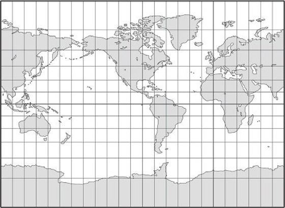 Abbildung 6 zeigt zwei wesentliche Merkmale des Mercatorentwurfs. Das erste ist die enorme Streckung der Meridiane nach den Polen hin. Das zweite ist die in der Karte als Gerade zwischen zwei Punkten verlaufende Loxodrome. Wegen der zweiten Besonderheit spielt die Mercatorkarte heute noch in der Seefahrt eine wichtige Rolle. Der mit der unendlich groß werdenden Flächenverzerrung in Polnähe verbundene Nachteil wirkt sich für die Seefahrt kaum aus. Der Vorteil der Geradlinigkeit der Loxodrome in der Karte liegt für den Seemann auf der Hand: Er kann zwischen zwei Punkten mit einem konstanten Kurswinkel fahren, während dieser sich auf der Orthodrome ständig ändert.