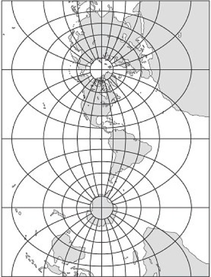 Im 20. Jahrhundert sind zahlreiche unecht zylindrische Entwürfe veröffentlicht worden, die in mancher Beziehung, insbesondere hinsichtlich der Formtreue (punktförmige Pole, elliptische Umrißlinie u.a.) gegenüber den echten Zylinderentwürfen Vorteile aufweisen. [KGS]