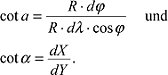c) Der Mercatorentwurf, von Gerhard Kremer, genannt Mercator, 1569 erstmals für eine Erdkarte verwendet, ist ein winkeltreuer Zylinderentwurf. Winkeltreue setzt Konformität voraus. Die Verzerrungsellipse ist in jedem Kartenpunkt ein Kreis, dessen Radius in Abhängigkeit von der geographischen Breite variiert ( Abb. 5). Nach der Abbildung zu Längenverzerrung nehme man in einem Punkt P der Kugel eine Richtung a an und im zugehörigen Kartenpunkt P' die entsprechende Richtung α, so ergeben sich die Kotangens beider Winkel zu: