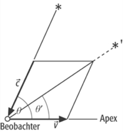 Aberration, E aberration, scheinbare Ortsverschiebung eines Gestirns, resultiert aus der Bewegung des Beobachters und der Endlichkeit der Lichtgeschwindigkeit c. Bewegt sich der Beobachter mit Geschwindigkeit [v pfeil] gegenüber einem Ruhesystem, so erscheint das Bild eines Gestirns in Richtung auf den Apex der Bewegung hin verschoben (Abb.). Die Änderung des Apexwinkels Δ θ ergibt sich in quasi-Newton'scher Näherung zu Δ θ ≈ κ · sin θ, wobei κ=v/c die Aberrationskonstante bezeichnet. Die jährliche Aberration resultiert aus der jährlichen Bewegung der Erde um die Sonne (κa=20,″49552 für die Epoche J2000), die tägliche Aberration aus der Rotationsbewegung der Erde. Die Änderungen der Äquatorkoordinaten (α, δ) eines Sternes ergeben sich in erster Näherung aus [m pfeil] =const · ([m pfeil] + [v pfeil]/c) mit