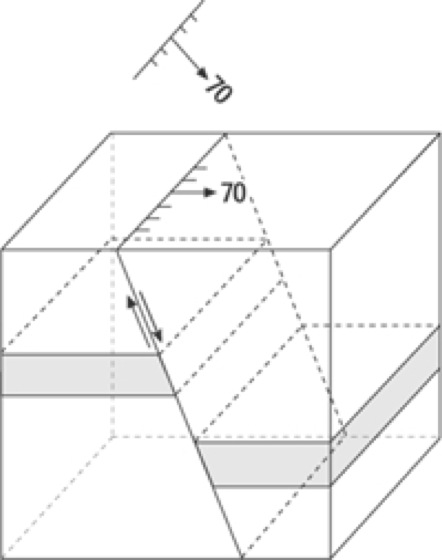 Abschiebung, E normal fault, aus dem Informationsinhalt in geologischen Karten interpretierte räumliche Anordnung von zwei Bruchschollen im Untergrund. Die relative Lage der Schollen wird meist durch spezielle Signaturen angegeben (vgl. Abb.). Abschiebungen zeigen Dehnungsstrukturen an.