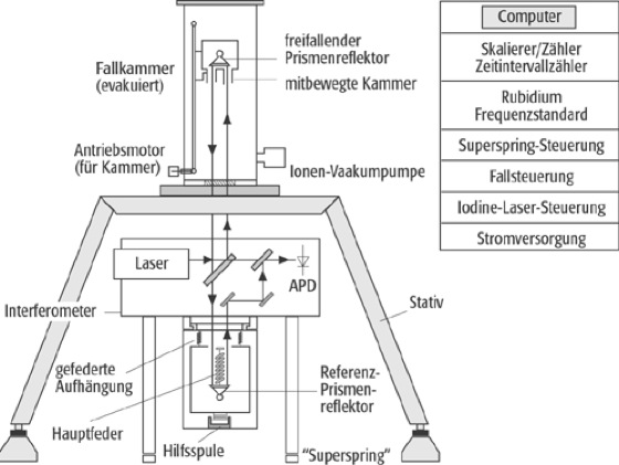 sowie die eigentlich gesuchte Schwere g zu bestimmen. Tatsächlich werden jedoch zahllose Einzelmessungen je Trajektorie und zahlreiche Trajektorien vermessen, wodurch sich im Mittel eine Präzision von einigen 10-9 g erzielen lässt. Nachdem in den letzten Jahren Aufgaben wie Laserstabilisierung, Elimination des Restluftwiderstandes des evakuierten Fallrohres, Eliminierung von Bodenvibrationen etc. gelöst wurden, liegen die gegenwärtigen Herausforderungen in der Erleichterung der praktischen Operation (Abb.) durch z. B. Verkleinerung, Robustheit, Verkürzung der Beobachtungszeit, Verringerung des Zeit- und Kostenaufwandes.