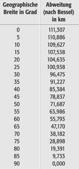 Abweitung:Abweitung: Distanz zweier Längenkreise auf unterschiedlichen Breitenkreisen.