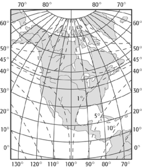 Äquideformaten, E distortion isograms, Linien gleicher Verzerrung. Für systematisch auf der Abbildung verteilte Punkte werden die Verzerrungen eines bestimmten Elements (Längen, Flächen, Winkel) berechnet. Durch Interpolation werden, ähnlich wie die Isohypsen in einem Höhenpunktfeld, Linien gleicher Verzerrung gewonnen. Dieses Verfahren ist insbesondere bei unecht kegeligen und schiefachsigen Kartennetzentwürfen anwendbar, weil es schwierig ist, bereits aus dem Koordinatennetz der Abbildung Schlüsse auf die Verzerrungsverhältnisse zu ziehen. Beispiele sind die in den Abbildungen 1, 2 und 3 dargestellten Entwürfe: der äquidistante azimutale Kartennetzentwurf(Abb. 1), der flächentreue azimutale Kartennetzentwurf (Abb. 2), beide in allgemeiner Lage, und Bonnes unechter Kegelentwurf(Abb. 3). In allen drei Abbildungen ist den Linien gleicher Winkelverzerrung das Kartennetz der geographischen Koordinaten untergelegt. Für die echt kegeligen Kartennetzentwürfe in polarer Lage (normale Abbildung) sind die Bilder der Parallelkreise zugleich Äquideformaten für die verschiedenen Verzerrungsarten.