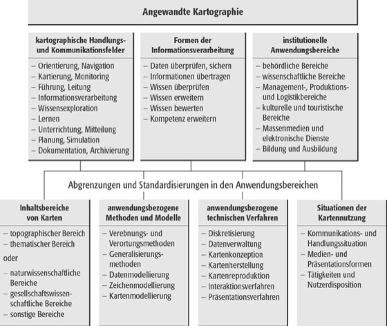 Die genannten konkreten kartographischen Anwendungsbereiche unterscheiden sich vor allem hinsichtlich ihrer staatlichen oder privatwirtschaftlichen Aufgaben und weniger aufgrund ihrer kartographischen Anwendungen, die sich zum Teil in theoretischer und technologischer Hinsicht gleichen. So sind beispielsweise in der Raumordnung oder der Regionalplanung verschiedene kartographische Handlungsfelder relevant, die in den unterschiedlichen Phasen der Planung aber gleichzeitig auch in anderen Anwendungsbereichen zum Tragen kommen. In den verschiedenen Anwendungsbereichen erfolgt die technologische Entwicklung vor allem aber auch die Implementation von Informations-, Auskunftssystemen etc. in Form sog. Fachsysteme zum Teil völlig unabhängig von Entwicklungen in benachbarten Bereichen.