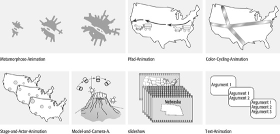 Animationstyp, E typ of animation, spezielle Ausprägung einer Computeranimation. Die verschiedenen Animationstypen zeigt die Abbildung: Metamorphose-Animation (kontinuierliche Veränderung der Gestalt eines Animationsobjektes), Pfad-Animation (Bewegung eines Animationsobjektes entlang eines definierten Pfades), Color-Cycling-Animation (Erzeugung optischer fließender Farbwellen zur Darstellung fließender Bewegung), Stage-and-Actor-Animation (Veränderung von Animationsobjekten nach Handlungsskripten auf einem Hintergrund), Model-and-Camera-Animation (3D-Animation mit Veränderung von Graphikobjekten, Kamera oder Lichtquellen, die in Form von Modellen beschrieben werden), Slideshow (Folge von Einzelszenen, die inhaltlich in Beziehung stehen), Textanimation (dynamische Präsentation von Text). In der kartographischen Animation sind von besonderem Interesse die Metamorphose-Animation zur Darstellung von Ausbreitungsphänomenen, die Pfad-Animation zur Darstellung von Wanderbewegungen, die Color-Cycling-Animation zur Darstellung von Waren- oder Verkehrsströmen und die Model-and-Camera-Animation für die Erzeugung dreidimensionaler Landschaften, die interaktiv vom Nutzer durchwandert oder überflogen werden können.