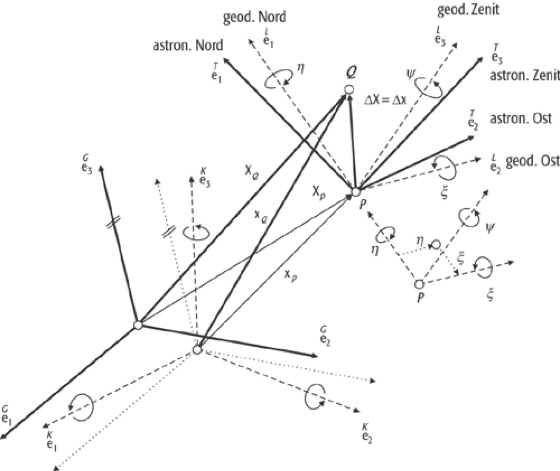 Astrogeodätische Lotabweichung:Astrogeodätische Lotabweichung: Transformation zwischen topozentrischem astronomischem und lokalem ellipsoidischemKoordinatensystem.