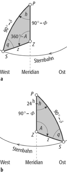 astronomisches Dreieck:astronomisches Dreieck: Lage des Sterns westlich (Teil a) oder östlich (Teil b) vom Meridian. Gestirn (S), Himmelspol (P), Zenit (Z), Deklination des Sterns (δ), Zenitdistanz (z), Höhe des Gestirns über dem Horizont (a), astronomische Breite (φ), Stundenwinkel (h), Azimut (A), parallaktischer Winkel (q).