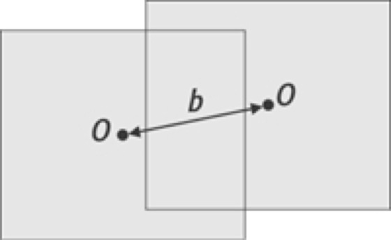 Aufnahmebasis, E base of survey, in der Photogrammetrie die Strecke b zwischen den ProjektionszentrenO von zwei benachbarten Bildern eines Bildpaares oder einer Bildreihe.