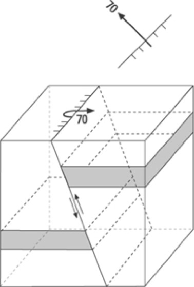 Aufschiebung, E thrust fault, high angel reverse fault, aus dem Informationsinhalt in geologischen Karten interpretierte räumliche Anordnung von zwei Bruchschollen im Untergrund. Die Bruchfläche steht dabei in einem Winkel von < 45° bezogen auf die Horizontale. Aufschiebungen zeigen Einengungsstrukturen an (Abb.).