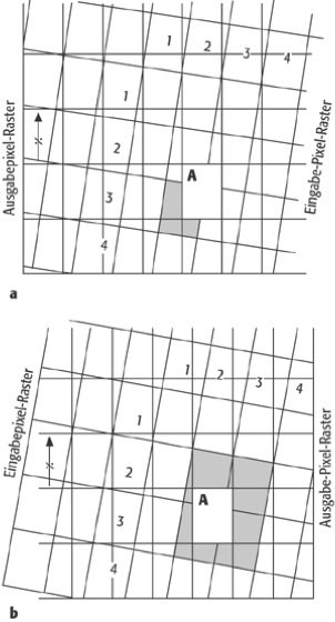 Ausgabepixel, E output pixel, das Bildelement eines entzerrten Bildes. Der Grauwert eines Ausgabepixels kann über verschiedene Wege bestimmt werden. Gleich ist nur, dass immer die Bildelemente des Eingabebildes aus der unmittelbaren Umgebung der ursprünglichen Lage einbezogen werden. Methoden der Grauwertbestimmung sind die Methode des nächsten Nachbarn (Nearest-Neighbour-Verfahren und die bilineare Interpolation. Erstere ist in Teil a) der Abb. dargestellt. Der Grauwert von Bildelement A wird vom schraffierten, nächstliegenden Pixel bestimmt. Teil b) der Abb. zeigt die Methode der bilinearen Interpolation. Der Grauwert von Bildelement A wird hier durch die gewichteten Werte der schraffierten vier Umgebungspixel des Eingabebildes beeinflusst.